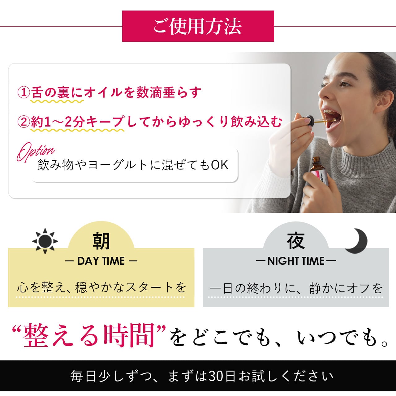 使用方法:使用前に容器を軽く振り、数滴を直接または飲み物などと一緒にご使用ください。目安は3〜5滴です。