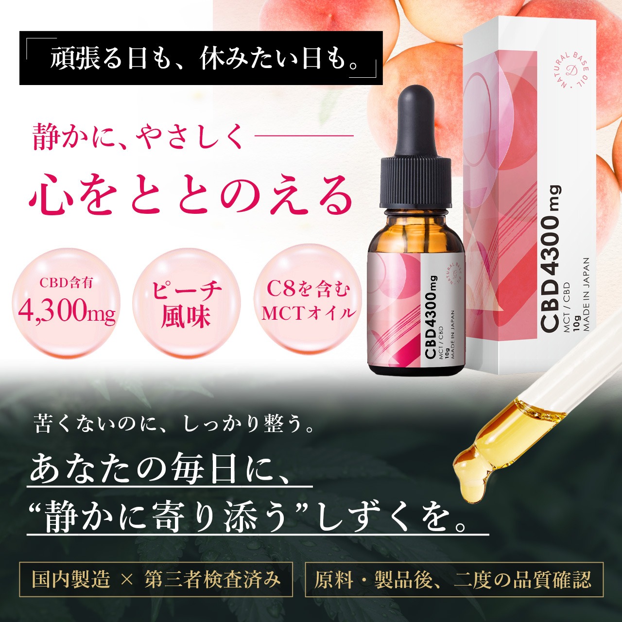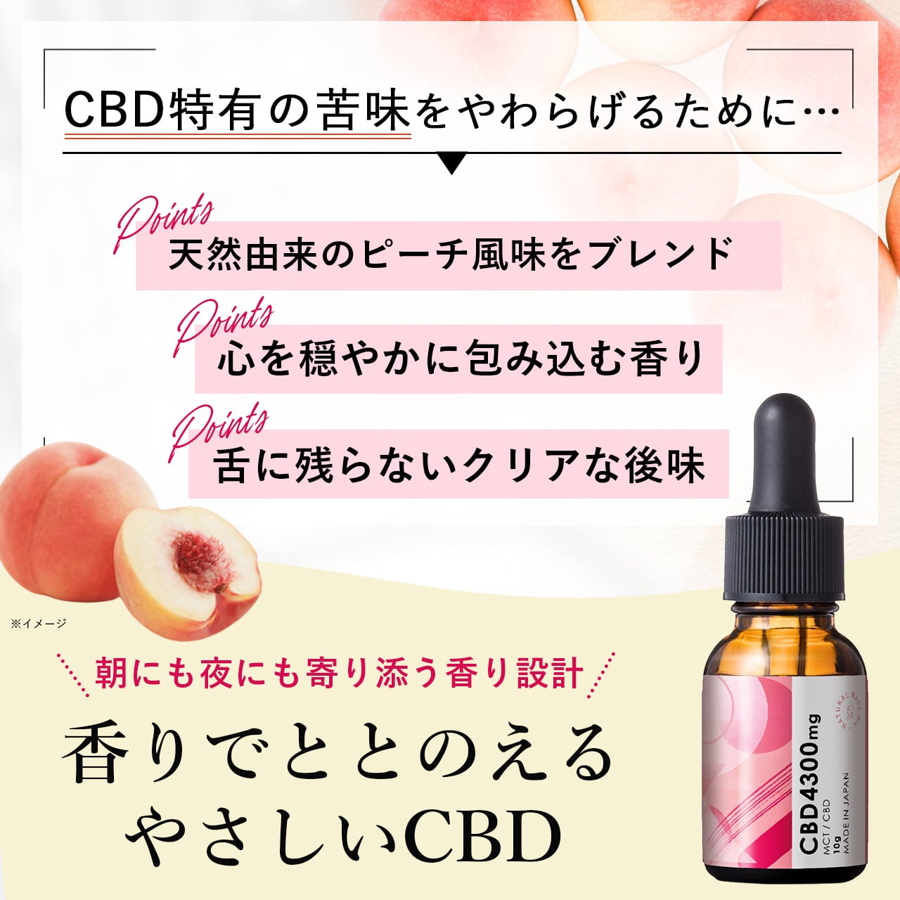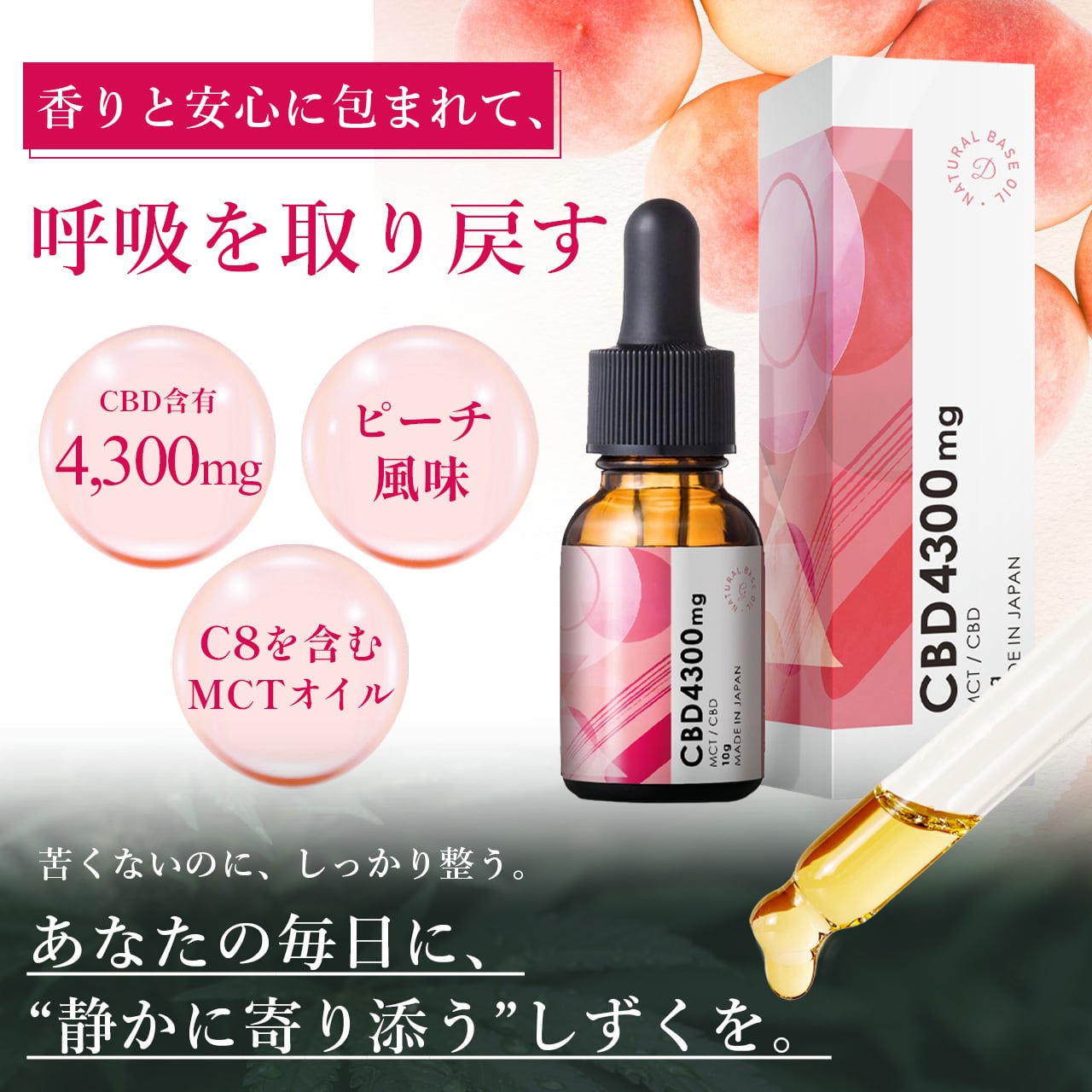 原材料名: 中鎖脂肪酸油(MCTオイル/マレーシア製造)、麻抽出物(カンナビジオール)香料(ピーチ由来)
