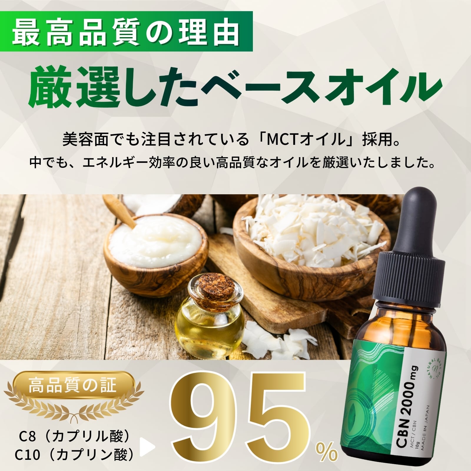 原材料名: 中鎖脂肪酸油(MCTオイル/マレーシア製造)、麻抽出物(カンナビノール)香料(オレンジ由来)